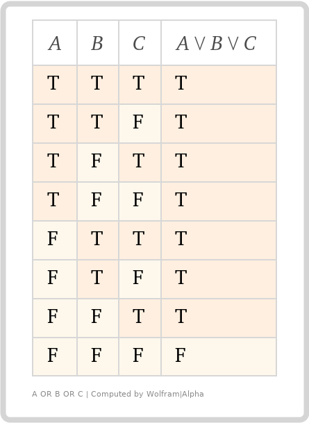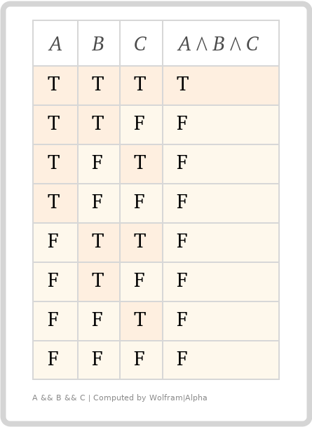 It looks MOSTLY correct, but notice, if all the assertions are true, the resulting assertion is also `true'! That's not what we want, but that is the mathematically correct result. So, we have to extend the logic definition to include "... AND NOT(A && B && C)". Our resulting truth table looks like this.